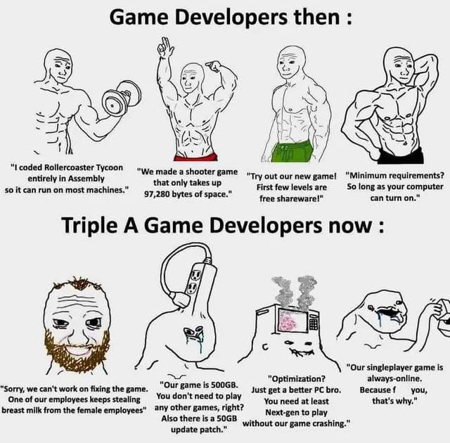 The industry continues to suffer from no longer being driven by a bunch of nerdy yet passionate guys slinging code in a shed somewhere, and instead being SuperMegaGloboCorp that thought hiring Sweet Baby Inc was a good idea.