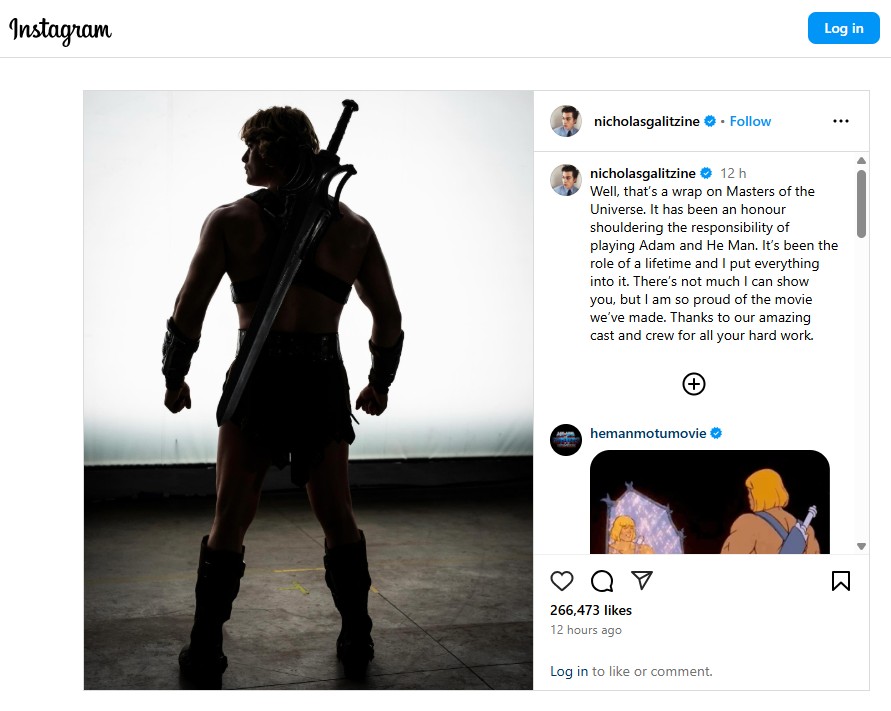 “Well, that’s a wrap on Masters of the Universe. It has been an honour shouldering the responsibility of playing Adam and He-Man. It’s been the role of a lifetime and I put everything into it. There’s not much I can show you, but I am so proud of the movie we’ve made. Thanks to our amazing cast and crew for all your hard work.”