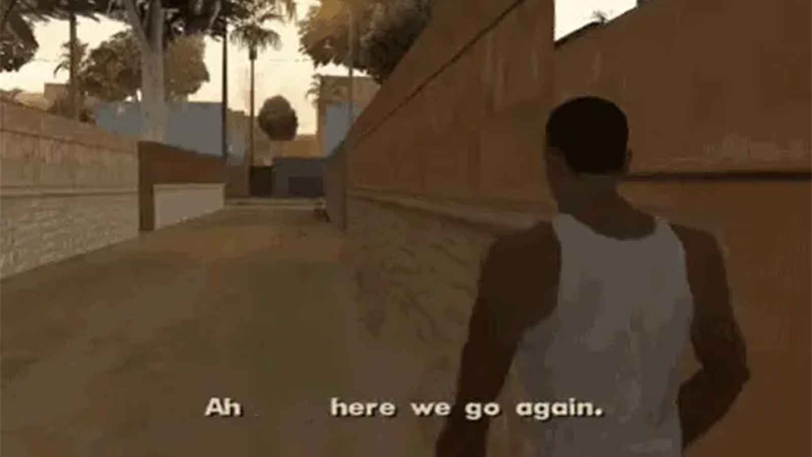 CJ’s opening line when returning to Los Santos turned into a reaction meme for recurring chaos. Its second life exploded when the image macro resurfaced across social media in the late 2010s.